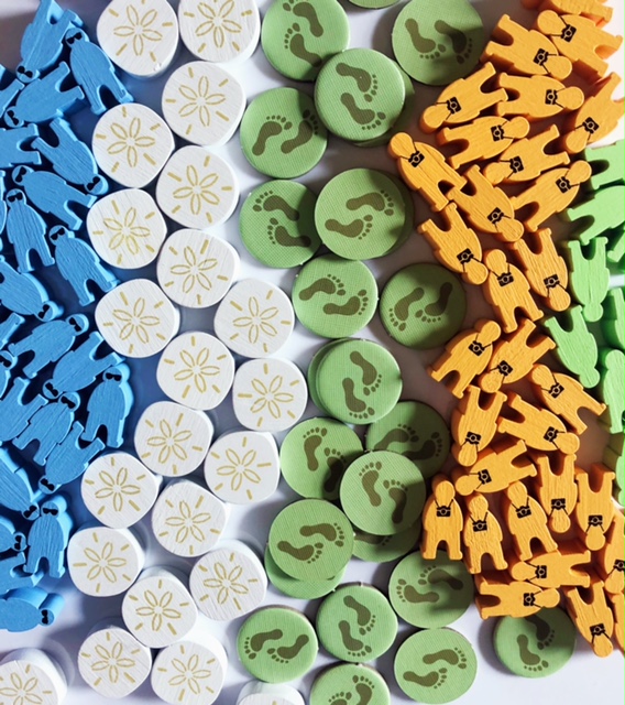 Each player receives a colored dwarf, a coordinating set of colored cards representing the spaces on the cave’s path, a treasure chest, and a treasure square.