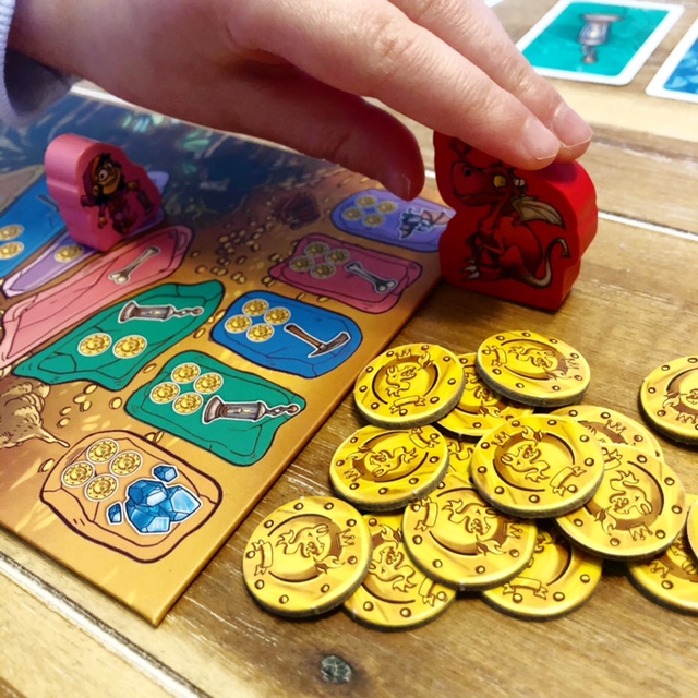Any cards played remain in front of each player until the player “resets” their hand by playing the grey treasure chest card and moving the gold coins from the treasure square to the treasure chest, which protects the coins from the dragon. The cards then go back into the player’s hand.