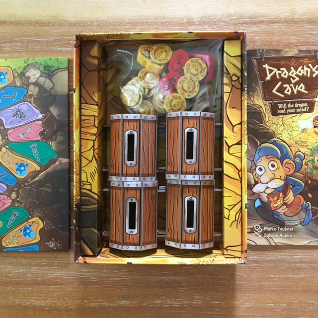 The components of the game are simple, but well-made and fit perfectly inside the box. The dwarves and dragon are nice chunky wood, and the treasure chests and gold coins are heavy cardboard. The cards are of good quality.